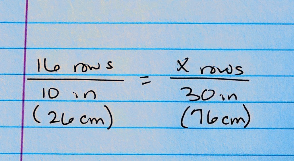 So if your swatch has 16 rows over 10 inches/26 centimeters and you want the final project to be 30 inches/76 centimeters long, your problem would look like this: