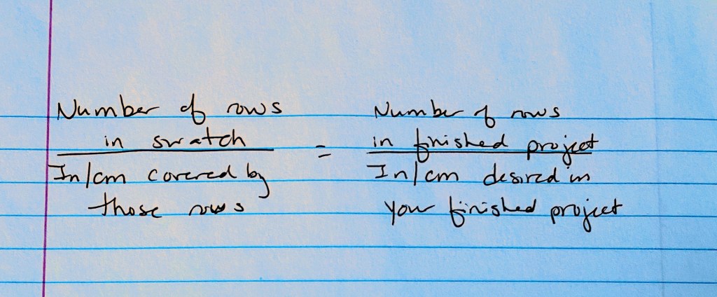 This next step is the other crucial time for your project. (If you haven’t noticed yet, every planning step is super important. Ignore them at your peril!) You need to have really good measurements for the size of the project itself if you want your project to be a perfect fit or size. If you are creating a scarf or a wrap, you can just go with your desired final dimensions and work toward that sort of on the fly or you can do this super evil algebraic proportion problem, if you like, to get your row count. It looks like this (it is sneering at you):