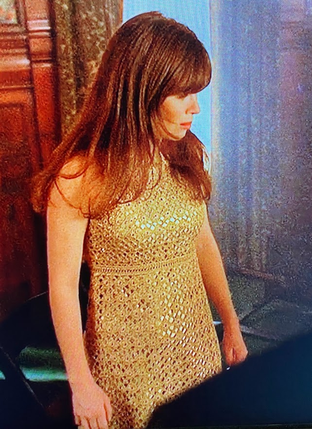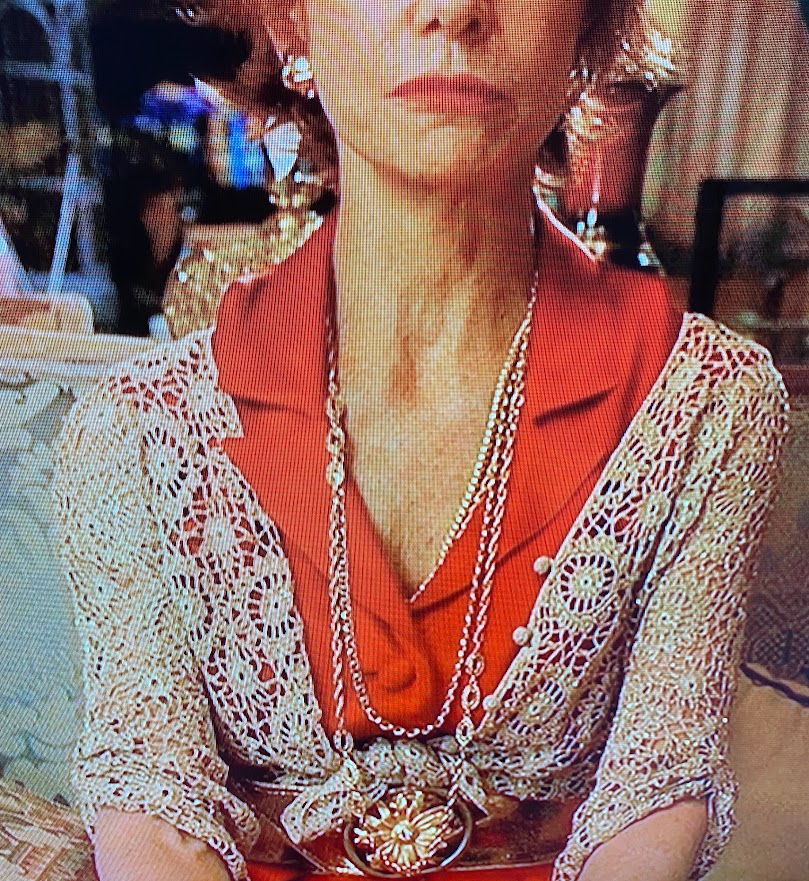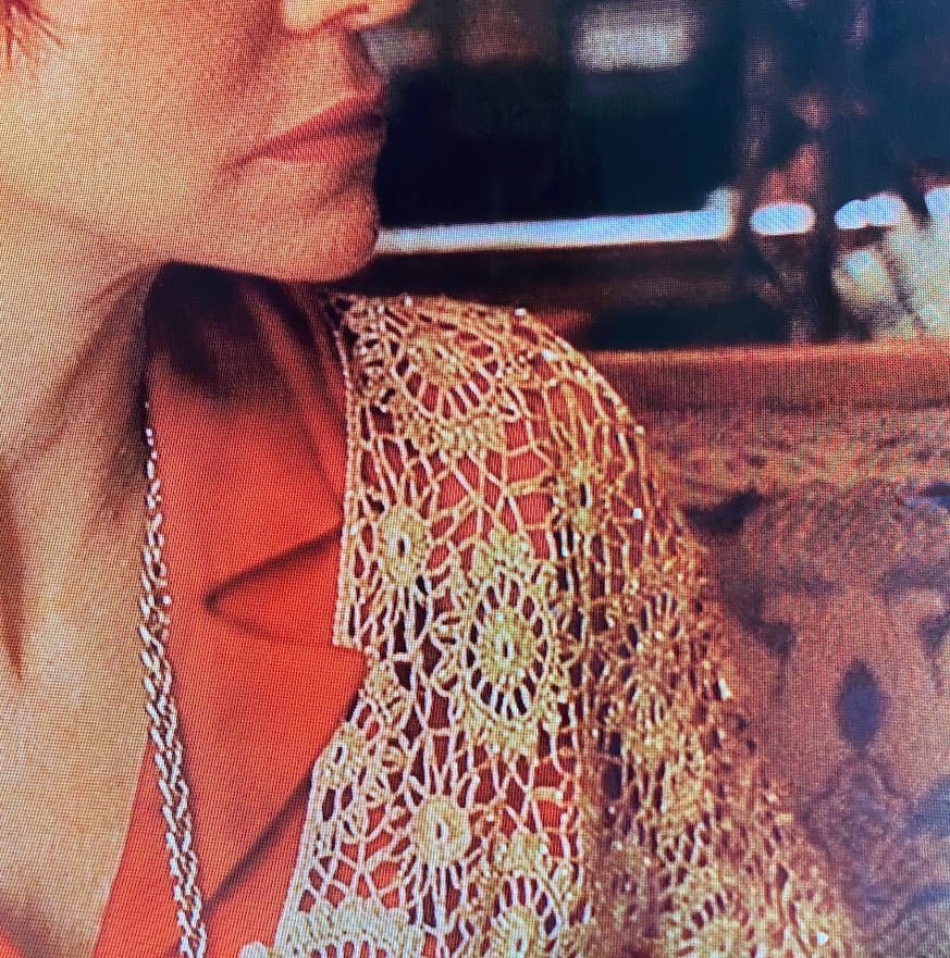 Charlotte’s dress in the first episode is eye-catching, but there is so very much more that I am now able to recognize as crochet. For the benefit of you, my dear, dear readers, I am watching the entire series while I exercise and taking small breaks to grab photos of the crocheted items I spot. Please forgive the grainy quality of some of the photos. They were taken in a period of self-imposed duress.