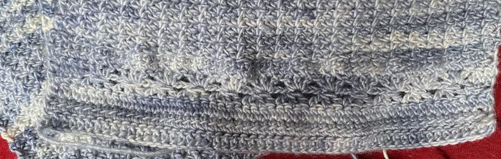 I am grandly upset with myself because I should have realized the issue when I made it. You see, I worked a little double crochet together shell sort of thing over four stitches in one row. It was cute and I was happy with it. At first, I worked a row of linked doubles for the next row, but that didn’t feel open enough to me. So I frogged that row and worked a row of what I naively thought was a reverse image of my weird little shells. Here was the problem: The first shell was worked over four stitches, in which the next shell started in the last stitch of the former shell. The reverse image was worked over five stitches. Since it was worked into the top of the shells from the last row, there was no overlap to happen. There were 12 shells in the first row with 4 stitches in each shell. There were 12 reverse shells in the second row with 5 stitches in each shell. I added 12 stitches to the row. Because I foolishly thought the weird lumpiness in the next row of linked doubles was a result of working it over open rows that needed to be blocked, I kept going. To nearly the end of the section. I realized my mistake when I tried to make my stitch counts match after the single crochet v-stitch section.