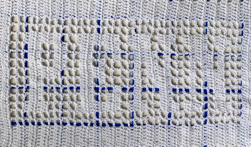 I started working it side to side. That was a fail. I felt like the letters weren’t as legible as they should be. An Etsy search led me to believe that working it side to side would be better, so I frogged the whole half of the monster I had finished and started fresh.