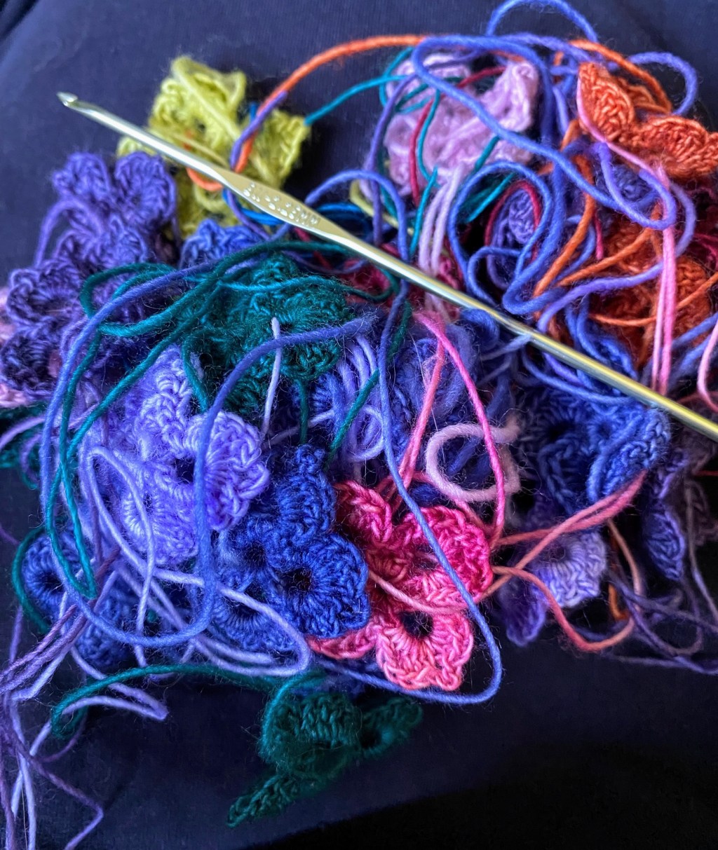 I plan to use the scraps and hanks I have amassed to play with colors dancing in and out and over the surface of this afghan. We shall see how that goes. I did decide to join them as I go, though now I have bunch I have to work in as I make more of them, because the idea of sewing together thousands of motifs made me realize I would be leaving this project unfinished in a box for my poor children to find and have to deal with someday, not impossibly, in the far future.