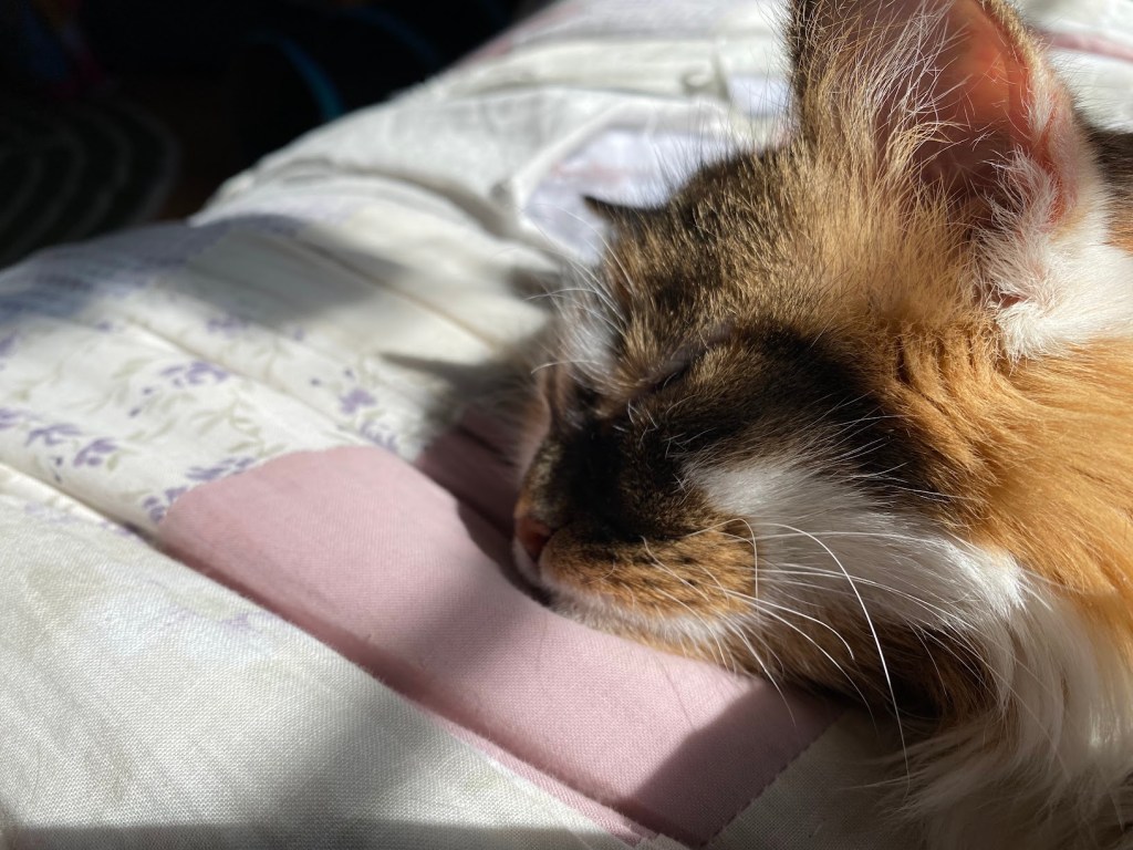 Except the blanket. The last minute blanket I started has gone nowhere. It’s sitting on the table where I write and staring at me in a sort of disappointed by not surprised sort of way. I think a lot of my yarn looks at me that way. At least my cat loves me.