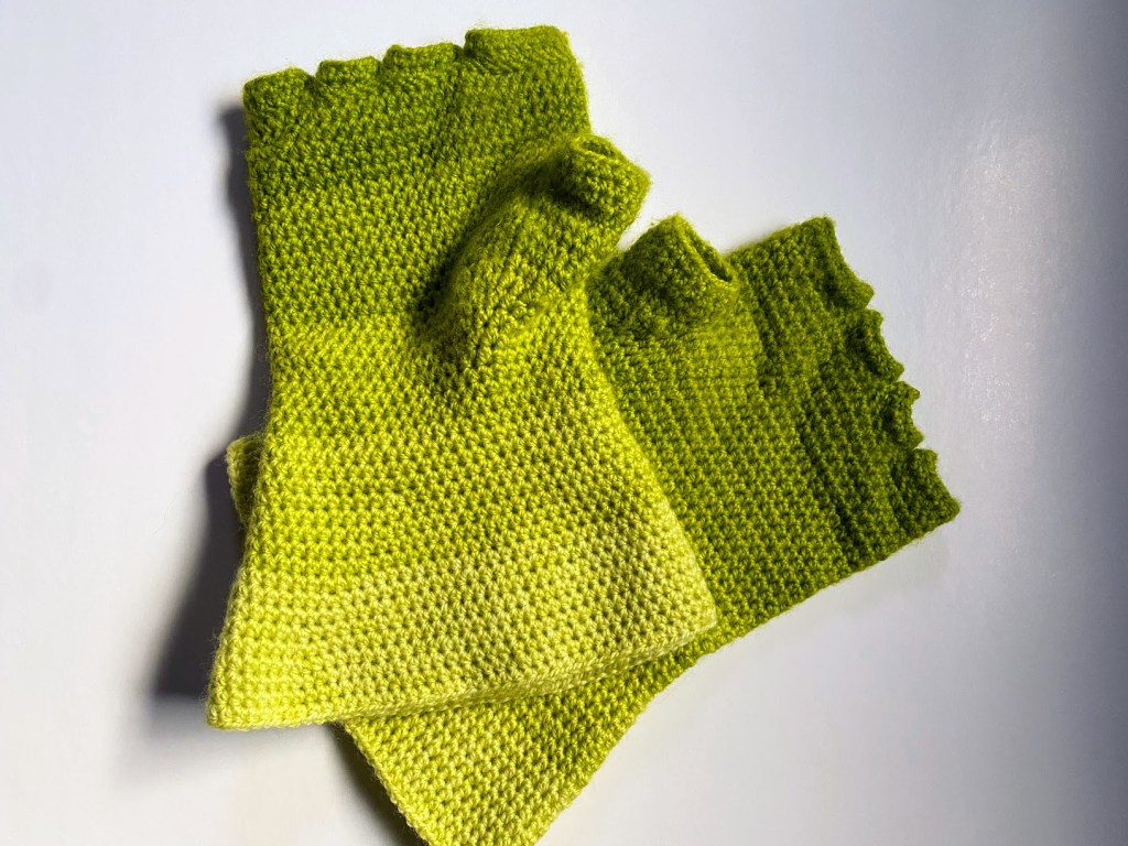 First, I made a pair of fingerless gloves for Adia. I used half double crochets and changed the color every seven rows or so. I wrote down what I did so both gloves would look the same. Look at me go! Adia requested individual finger holes for the gloves. Honestly, I really did not want to do that. It meant math. It meant being very deliberate and thoughtful. I tried to wiggle my way out but that felt wrong, so I just freaking did it. Did I have to frog the fingers like five times? Yes. Do they fit perfectly now? Also, yes. Look at them! Behold their wonder and the correctness of their math. Take that perimenopause brain! I did it despite you.