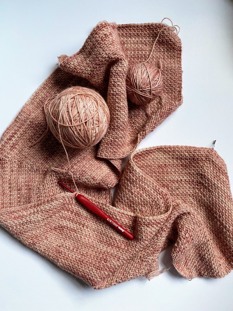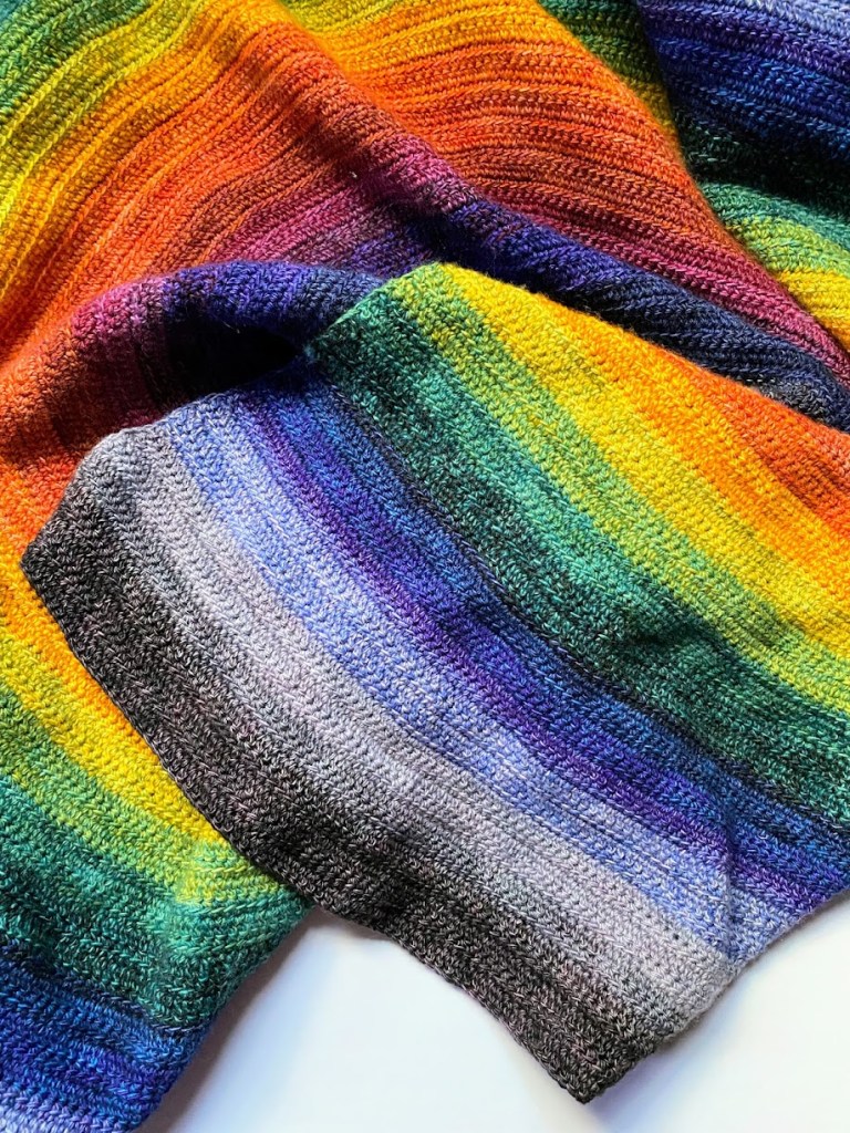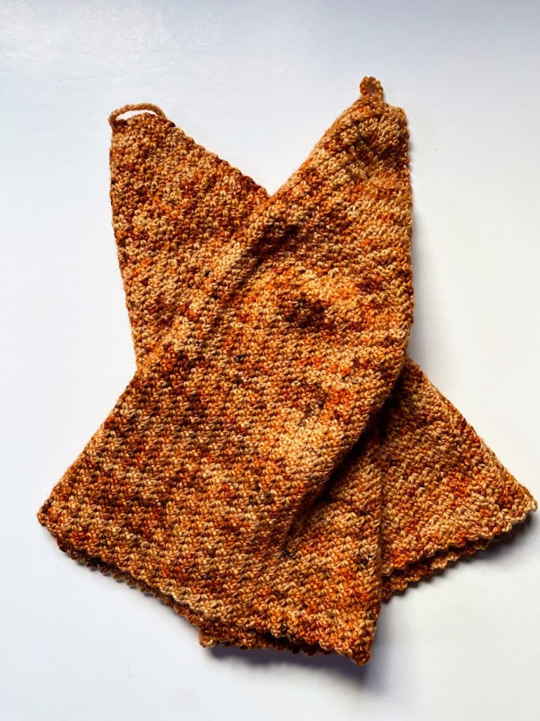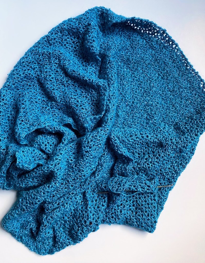 I also finished the marled wrap I was working on for Adia. This one is all linked doubles with two strands of Malabrigo lace yarn held double. I changed one strand when I felt that I could not bear to continue working in the present color combination anymore, which was often about seven rows. Twice I ran out of one color mid-row and just added a new color where the old one stopped. It isn’t readily visible. I am not upset by this. I do not think it disturbs some overall artistic feeling of the piece. It just is. I’m just happy it’s done. This one took a while.