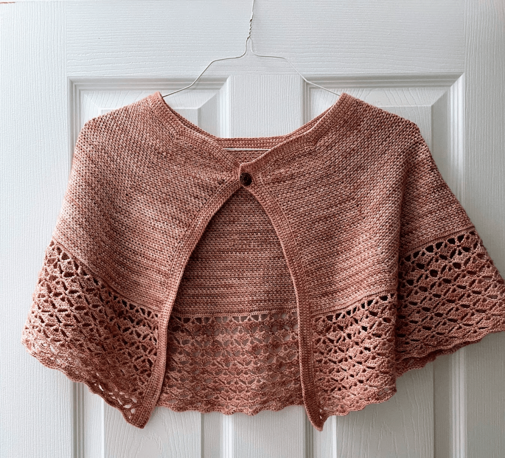 I ended the capelet off so it hits just below Hannah’s elbow. I then worked a button placket up and down each side and around the top. (I worked decreases across the top to make it lie flat.) I took a final round of single crochet around the entire capelet for that much coveted finished edge. I added a pretty button and found myself down a project! Happy day!