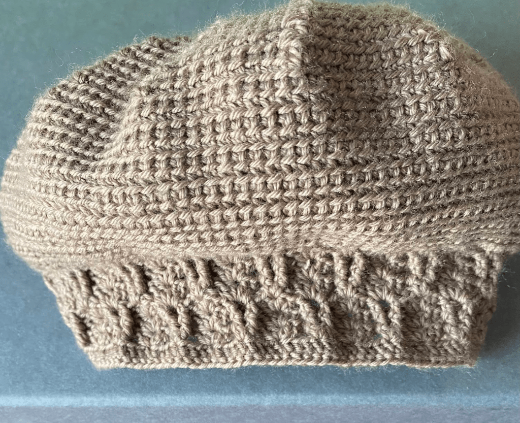 My mother’s hat was a last minute surprise project. I used some mushroom-colored stash yarn in a fingering weight. For the band, I used a textured lace stitch to allow for a snug but flexible fit. I worked this with a 2.75 mm hook. I really like this stitch pattern, so I was a little sad to switch to a different one, but such are the ways of hats. I bumped the hook size up to a 4 mm hook and worked linked double crochets, back loop only, for the body of the hat. The hook size bump gave the body of the hat a looser feel, which looks cute but doesn’t leave the wearer feeling like they look like they have a little pin head.