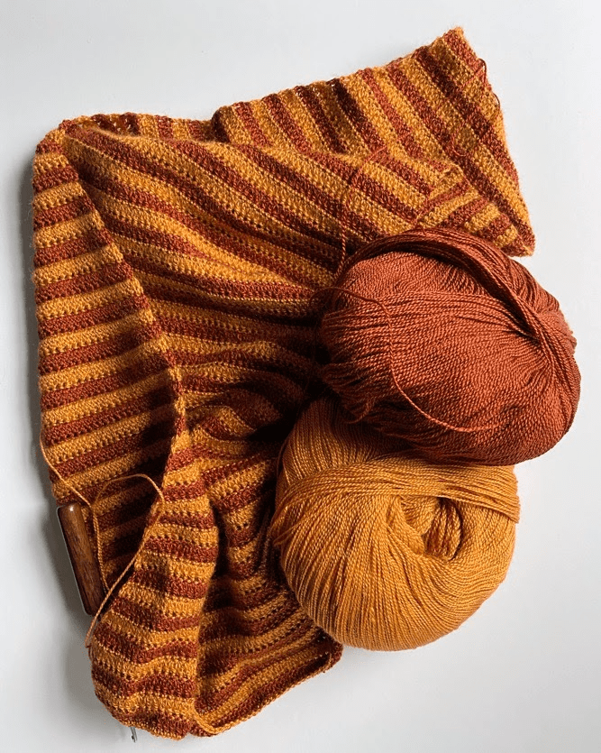 I am still working on Adia’s scarf. I really thought I was almost ready to start the decrease, so I measured the remaining yarn only to find I had about twenty grams left before I get to start decreasing. (I’m using half of the yarn on the increase section and half on the decrease section to create a narrow scarf/shawl/mini-shawl thing.) I worked two more stripes, one in yellow and one in brown. I trotted off to measure the remaining yarn, confident that I was ready to start decreasing, only to find I had used but a few grams. I worked another stripe and a half before bedtime last night. I hope to finish up more tonight. After I finish four more stripes, I’ll weigh the remaining yarn again. I have serious issues estimating how far yarn will go. I’m sure I’m going to end up working like a dozen more stripes before I start decreasing.
