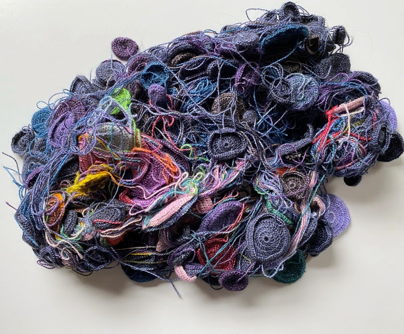 I started my circle project with a bunch of different colored yarns and then cut most of them out because I realized how busy the end product would look with circles worked in a lot of different colors. Instead, I kept a blue shade, a deep purple, a deep gray blue, and gray. I thought the little pops of color would be more aesthetic than tons and tons of colors. But here’s the thing: I think I underestimated how much damn yarn I would need to make circles for four whole freaking years. (Yes, a life theme. If I was a novel people could write essays about the meaning of my consistent yarn woes.)