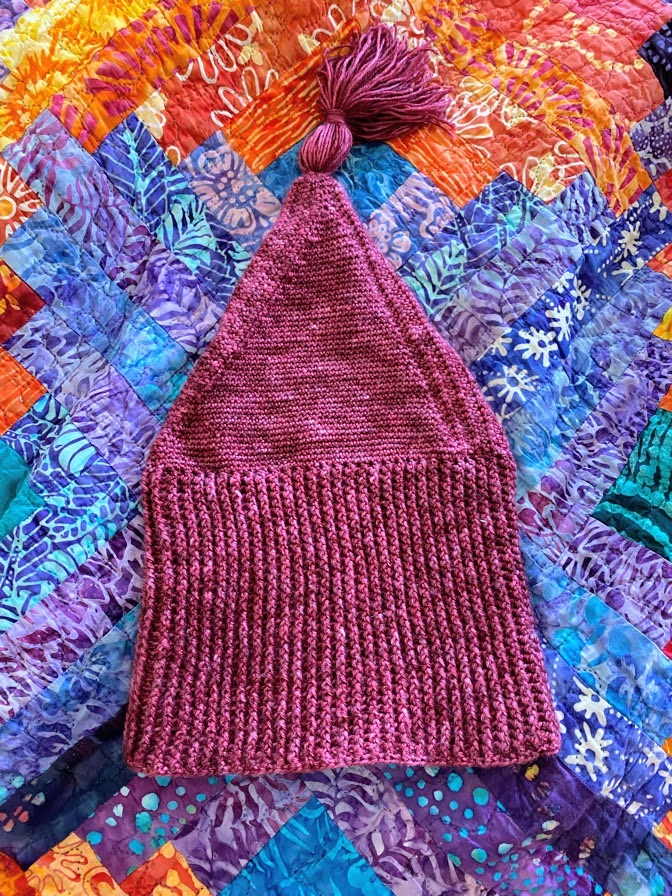 I think it came out nicely. I used the original pattern as a template but made lots of changes. I increased the ribbing section to be about six inches long instead of four. I used front and back post stitches to do the ribbing in the round. I feel like this is a stretchier, more effective ribbing. I did not do waistcoat stitch for the body of the hat. I used fingering weight yarn, and the idea of working between the single crochets made my old eyes very unhappy, so I did standard issue single crochets. I put in a little 4 single crochet v-stitch section at the front and back of the hat and ran the decreases on each side of this on every other row to create the point. I made an actual tassel instead of the little braid. I used fingering weight yarn and a 3.75 mm hook.