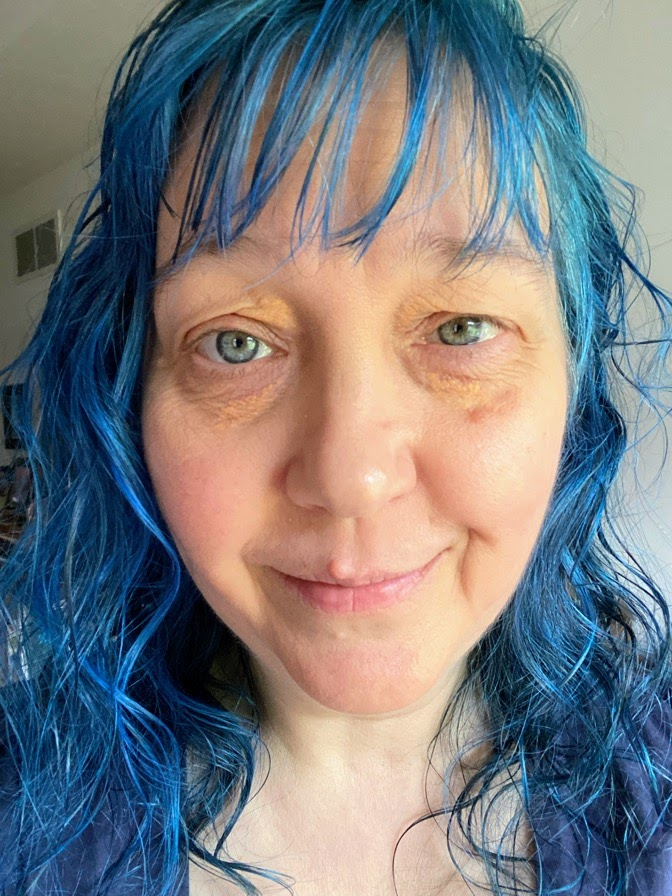Toned-down blue-haired me got looks. Bright purple me got looks. Both colors got compliments interspersed with the looks, so it was fine. Bright blue-haired me is apparently a freaking horror. I had several people refuse to look at me when I said good morning to them in the parking lot as we passed each other. The local Costco is a friendly place. People nod and say hi to each other as we wander in, or they did before I othered myself with my hair. Now, not so much.